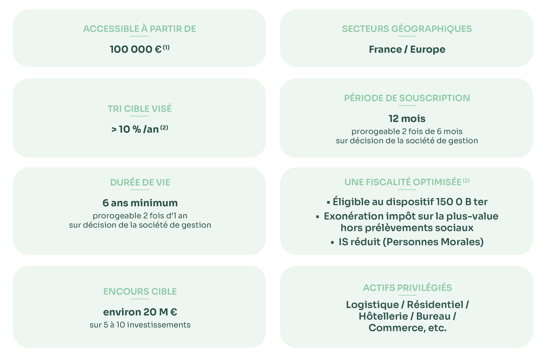La Société de Gestion décline toute responsabilité quant à l’exactitude ou au caractère exhaustif des informations contenues sur cette page qui font état d’analyses ou descriptions préparées par la Société de Gestion sur la base d’informations générales et de données statistiques historiques. Ces éléments, tout comme les performances passées du secteur de l’immobilier sont fournis à titre indicatif et ne sauraient constituer en aucun cas une garantie de performance future du FPCI. L’attention des souscripteurs est attirée sur le fait que, sauf cas de déblocage anticipé prévus dans le règlement du Fonds, votre argent est bloqué pour une durée minimale de 6 ans, cette durée peut être prorogée par la Société de Gestion pour 2 périodes successives de 1 an chacune maximum sur décision de la Société de Gestion. Les investisseurs potentiels devront effectuer leur propre diligence notamment quant aux conséquences juridiques, fiscales et financières et toutes autres conséquences de leur investissement dans le Fonds. Ceci ne constitue ni une recommandation d’achat ou de vente, ni une incitation à l’investissement dans les parts du Fonds. En prenant la décision d’investir, les Investisseurs Avertis potentiels doivent se fier à leur propre examen des caractéristiques du Fonds telles qu’elles sont exposées dans le présent document et le règlement du Fonds (le « Règlement »), en intégrant les avantages et les risques (section « Profil de Risque du Fonds » annexe II du Règlement). Toute personne désirant investir dans le Fonds doit être pleinement consciente que son capital n’est pas garanti, peut ne pas lui être restitué ou ne l’être que partiellement et n’est pas destiné à constituer la totalité de son portefeuille. Toute information contenue ici concernant le Fonds doit être interprétée à la lumière de la version finale du Règlement dont l’investisseur potentiel doit prendre connaissance avant toute souscription. En cas de divergence entre les informations présentées et le Règlement, ce dernier prévaudra.