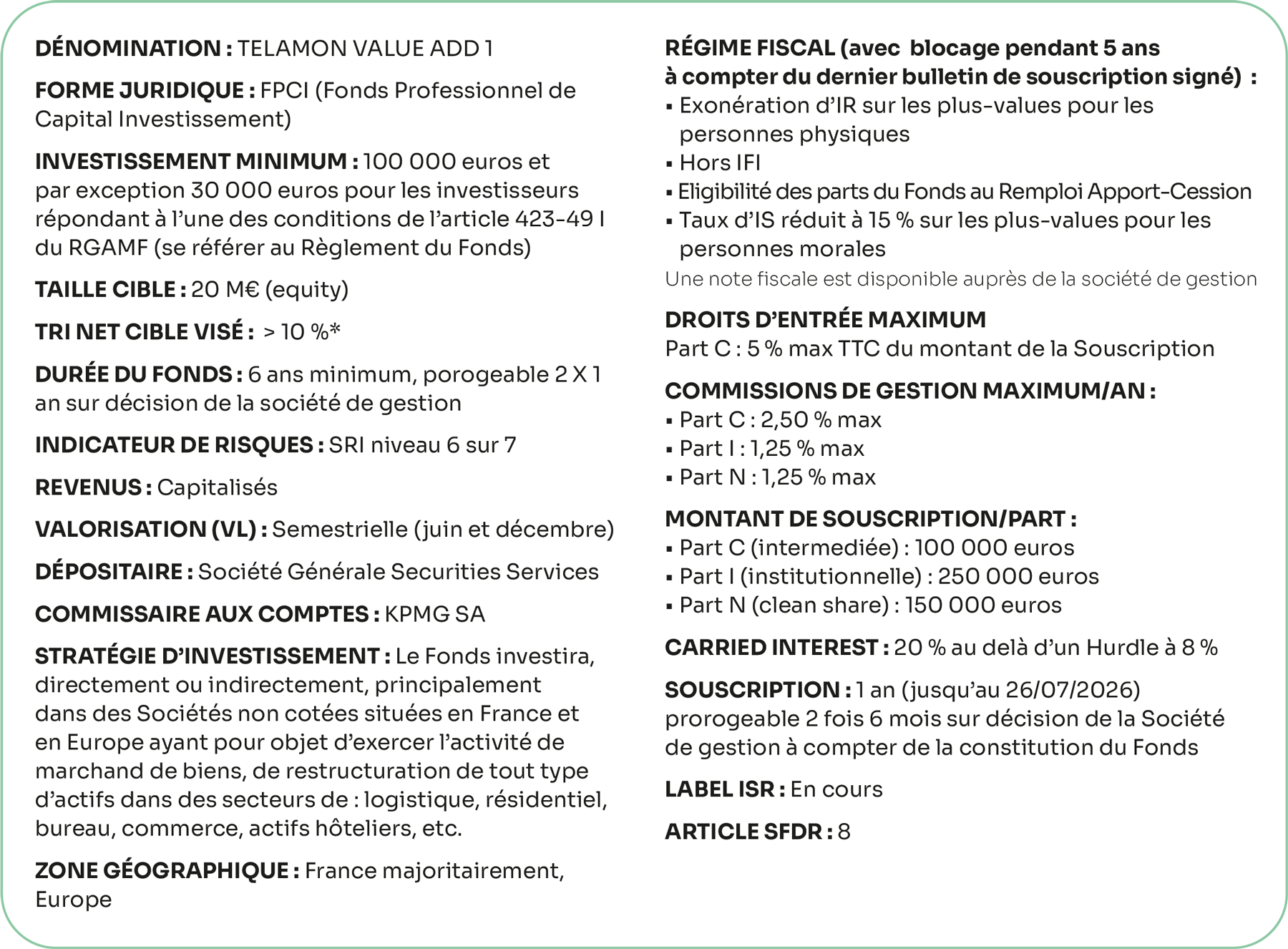 Le FPCI TELAMON VALUE ADD 1 (le «Fonds» ou le «FPCI») est un FPCI (Fonds Professionnel de Capital Investissement) régi par les articles L.214-159 et suivants du Code Monétaire et Financier, qui n’est pas soumis à l’agrément de l’Autorité des marchés financiers (AMF) et peut adopter des règles de gestion spécifiques dérogatoires aux fonds agréés. Toute personne désirant investir dans le Fonds est tenue de vérifier préalablement qu’elle appartient à l’une des catégories d’investisseurs mentionnées à l’article 423-49 I. du Règlement général de l’AMF et à l’article L. 214-160 du Code monétaire et financier.